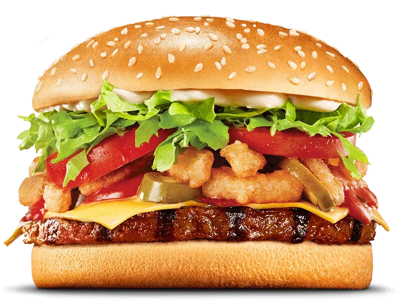 A plant-based flame-grilled patty, crowned with melted cheese, zesty tomato sauce, fiery angry onions, spicy jalapeños, fresh tomato, crisp lettuce, and creamy mayo, all nestled in a toasted sesame seed bun.